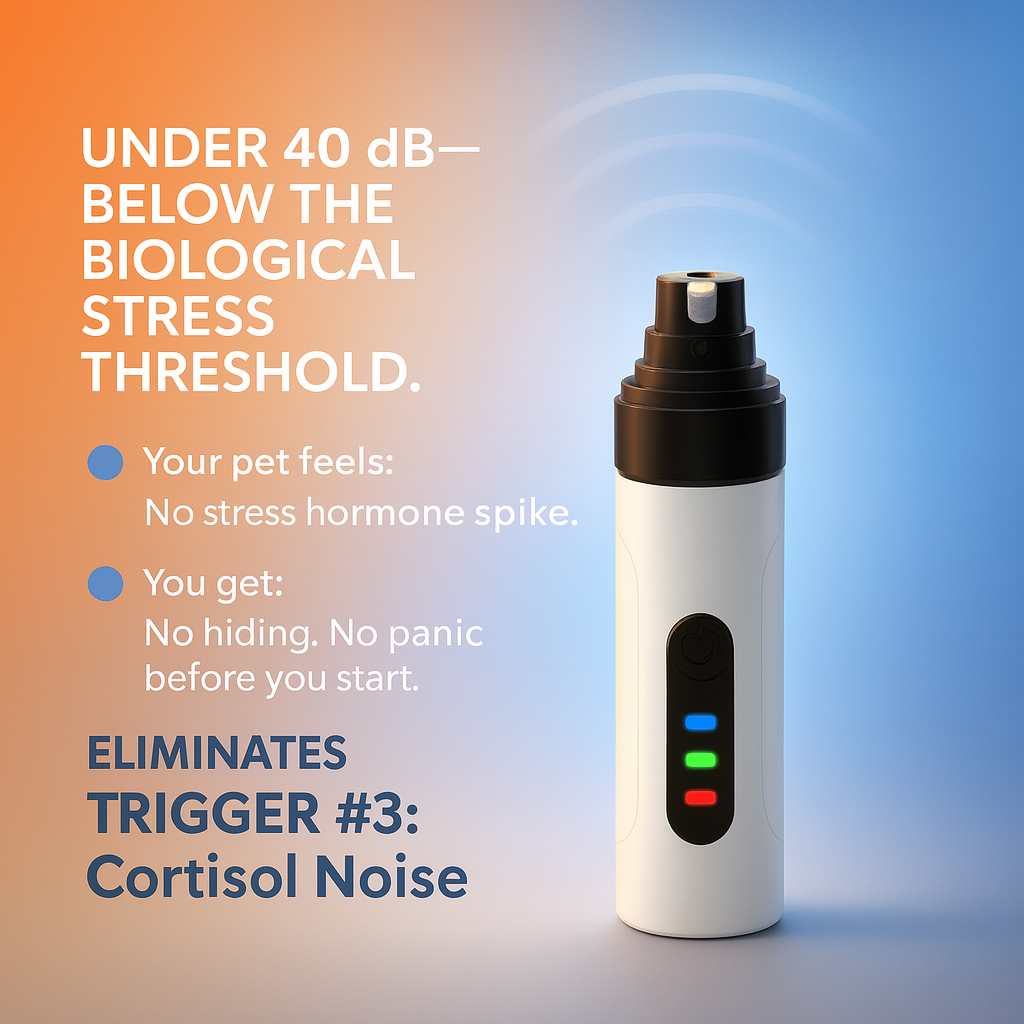 Under 40 dB = quieter than a whisper, quieter than a library. Normal conversation is 60 dB. Standard grinders are 90+ dB (power drill level). Your pet's stress response activates around 40-50 dB. ZooTrim stays below that threshold—nervous system stays calm. The science is explained in your "Why Your Pet Panics" eBook.