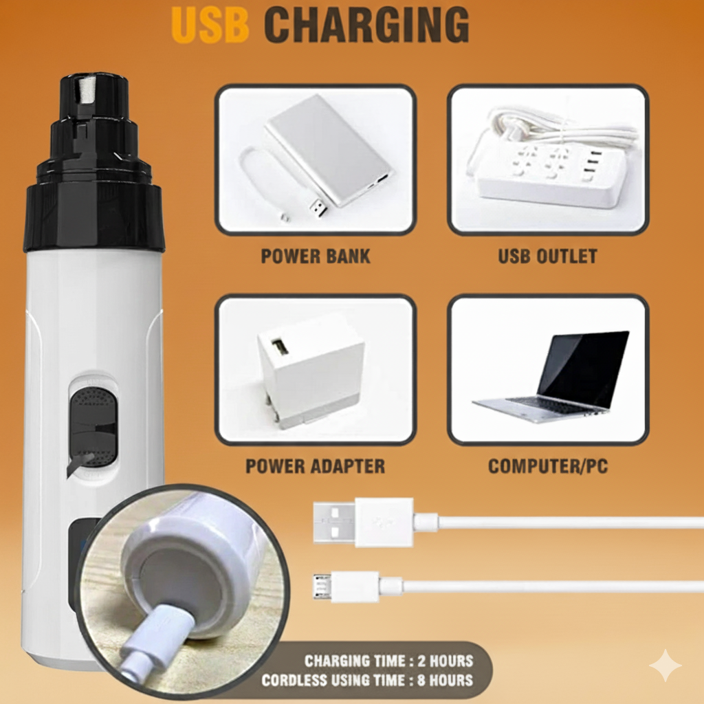 Up to 8 hours of continuous use on a single charge (depending on speed setting). For context, a full nail trim takes 5-10 minutes. So one charge = months of trims. It's USB rechargeable, so you can charge it anywhere. No more scrambling for batteries mid-trim or having a dead tool when your pet is finally calm and ready.